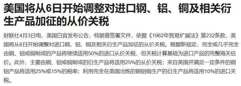 - 美国白宫发布公告,特朗普签署文件,依据《1962年贸易扩展法》第232条款,美国将从6日开始调整对进口钢、铝、铜及相关衍生产品加征的从价关税。