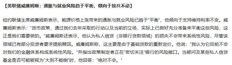 - 纽约联储主席威廉姆斯表示,能源价格上涨带来的通胀与就业风险已趋于“平衡”,他倾向于支持维持利率不变。威廉姆斯表示:“货币政策,通过我们去年采取的行动以及当前的立场,实际上已做好充分准备来平衡这些风险,这正是我们需要做的。”威廉姆斯还表示,他认为私人信贷(非银行贷款领域)的损失不会带来系统性风险,尽管该领域已有部分投资者要求提前赎回。