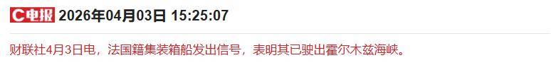 - 据报道,法国籍集装箱船发出信号,表明其已驶出霍尔木兹海峡。