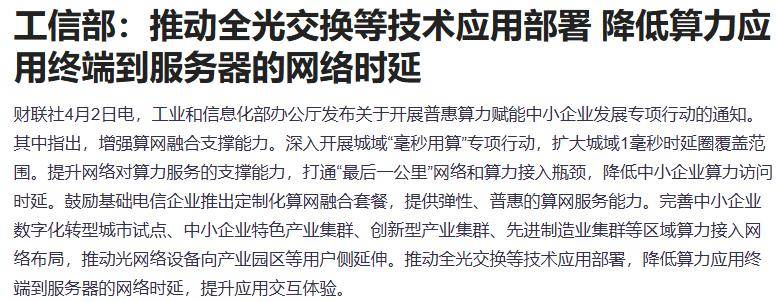 消息面来看,工业和信息化部办公厅发布关于开展普惠算力赋能中小企业发展专项行动的通知。其中指出,增强算网融合支撑能力。深入开展城域“毫秒用算”专项行动,扩大城域1毫秒时延圈覆盖范围。推动全光交换等技术应用部署,降低算力应用终端到服务器的网络时延,提升应用交互体验。