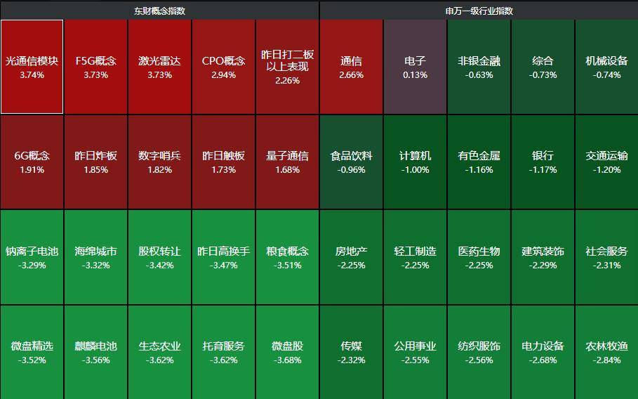 最后简单看下盘面,截至收盘,上证指数跌幅为1%,创业板指跌幅为0.73%。分行业来看,仅通信、电子行业上涨,农林牧渔、电力设备、纺织服饰、公用事业、传媒等行业领跌。