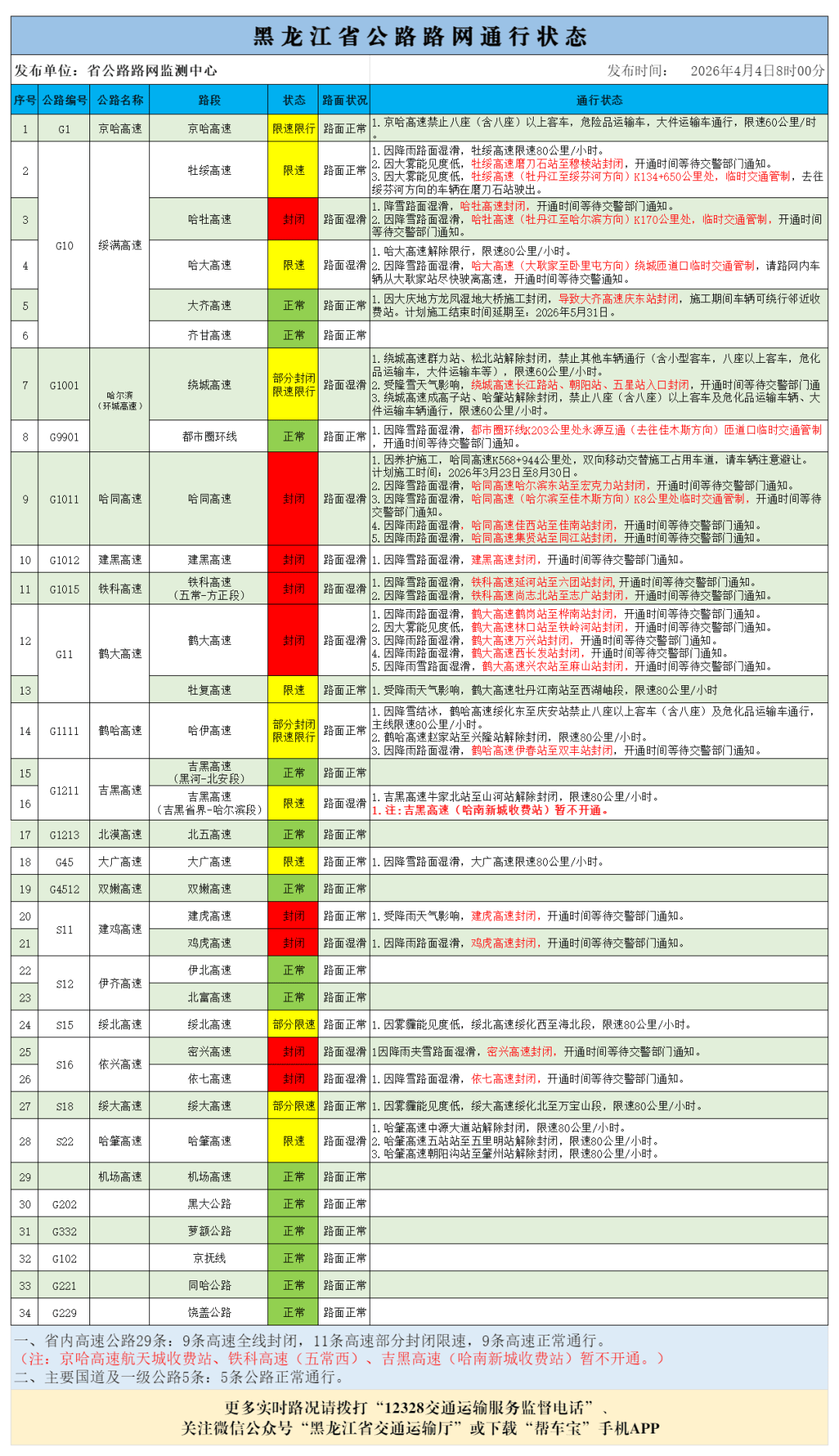 4月4日,黑龙江省交通运输厅发布全省高速公路路况信息, 受天气原因影响,部分高速封闭、限速限行。
