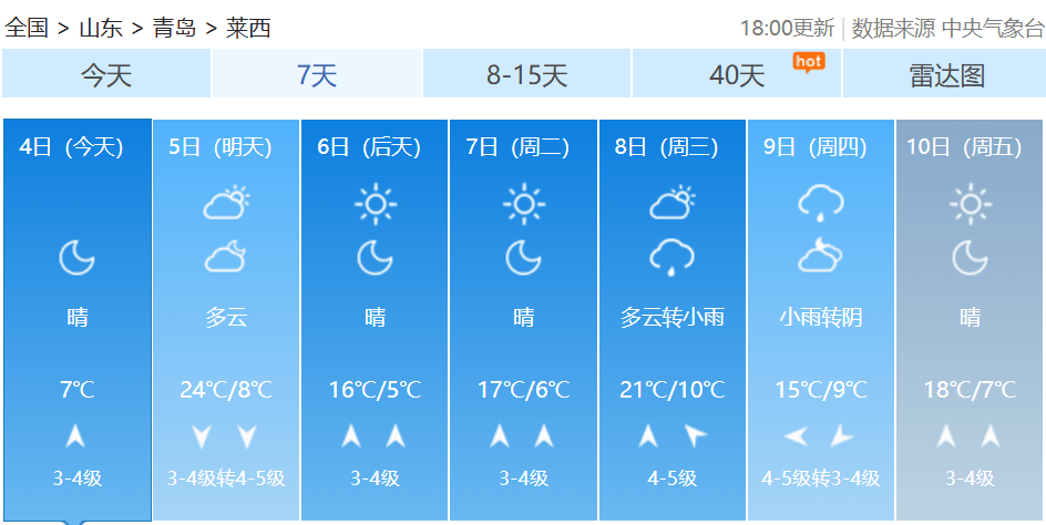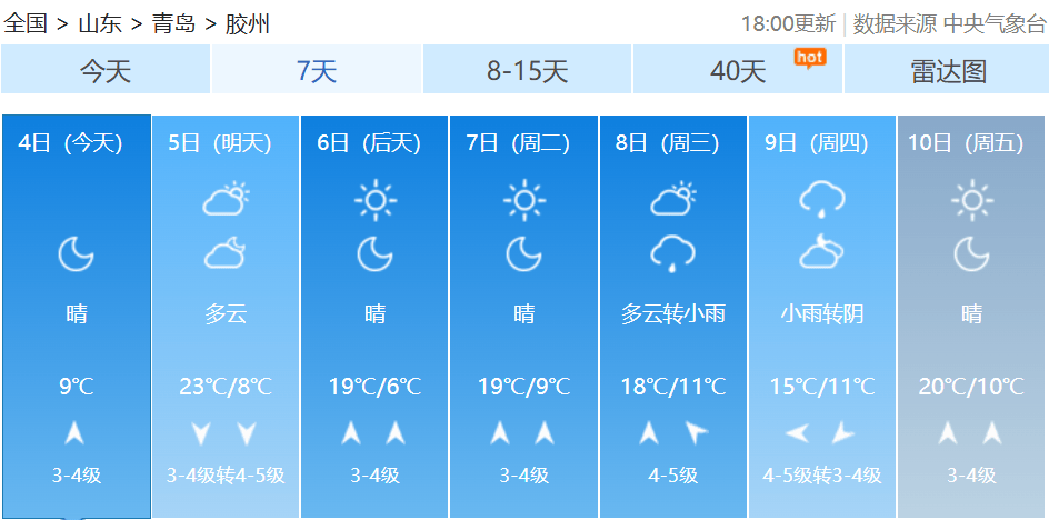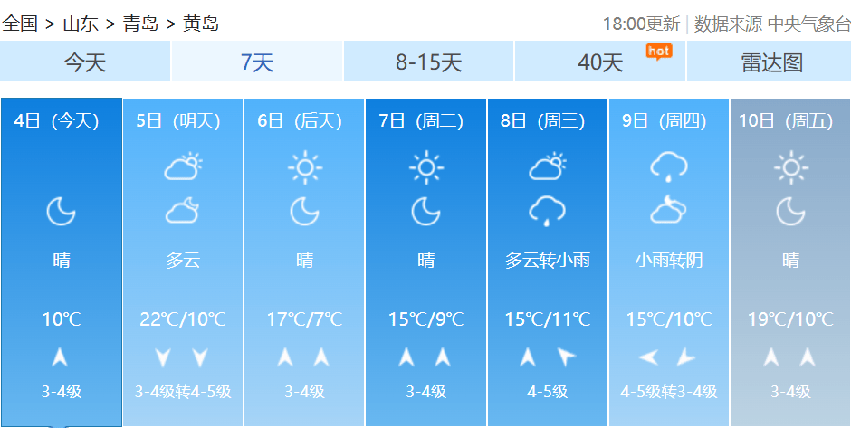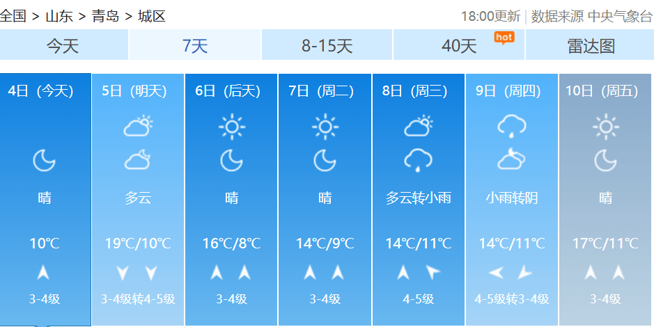 【青岛市区】5日白天,晴转多云,南风转北风3到4级阵风6级,相对湿度30%~70%,5日最低气温10℃,最高气温19℃。