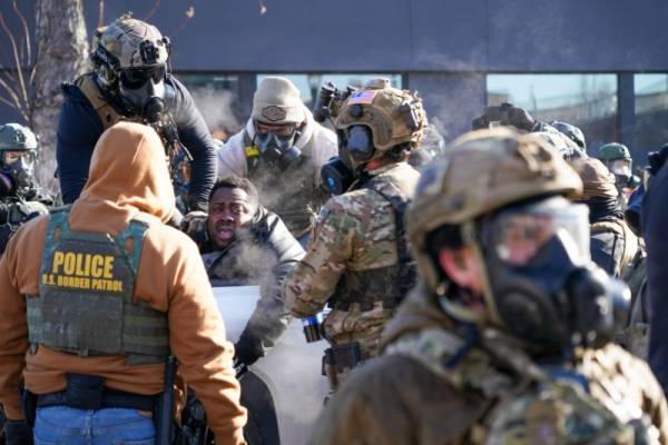 1月24日,美国明尼苏达州明尼阿波利斯市,美国执法人员将一名受伤的抗议者抬上皮卡车。IC Photo