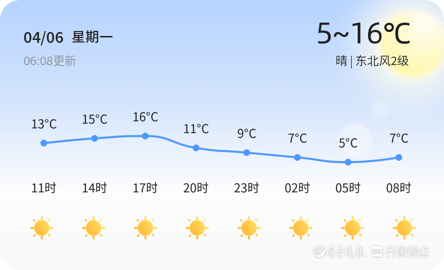 今天是4月6日,星期一,农历二月十九。德州今日天气晴朗,气温介于5℃至16℃之间,东北风2级,空气湿度为47%,PM2.5指数为43,空气质量良好。全市各区天气情况一致,均为晴朗天气,适合市民外出活动。