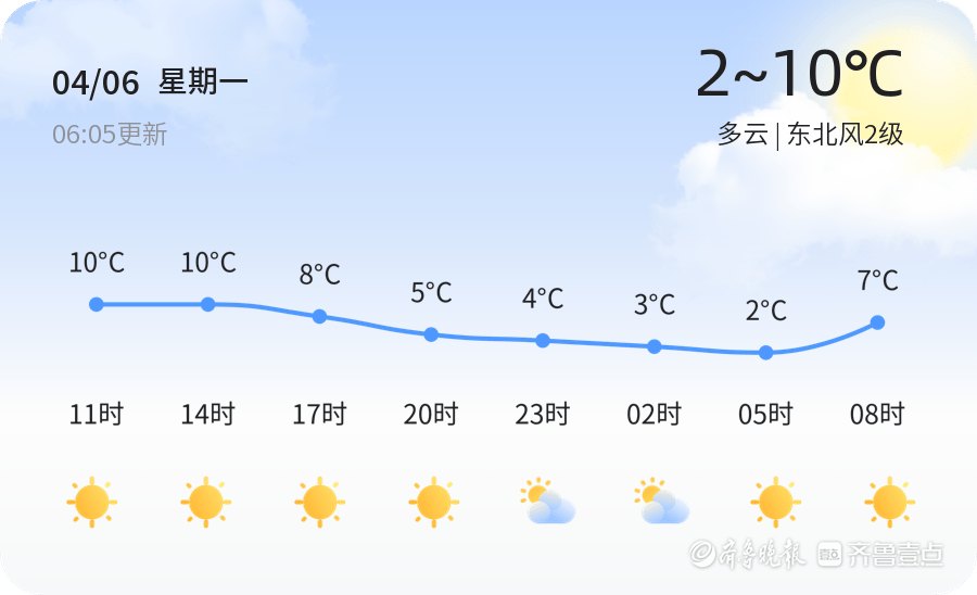 今天是4月6日,星期一,农历二月十九。威海市今日天气多云,气温在2℃至10℃之间,东北风2级。各区天气情况总体平稳,适合市民出行和户外活动。
