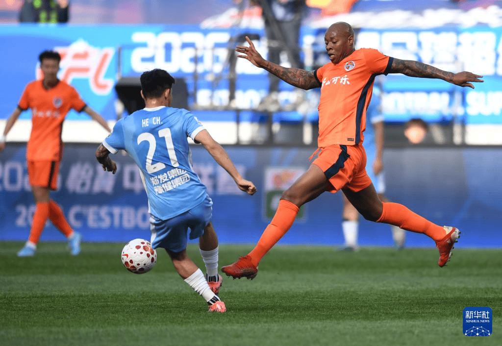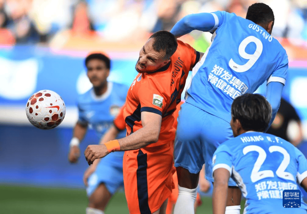 4月4日,青岛海牛队球员安杰尔科维奇(左二)与河南队球员古斯塔沃拼抢。