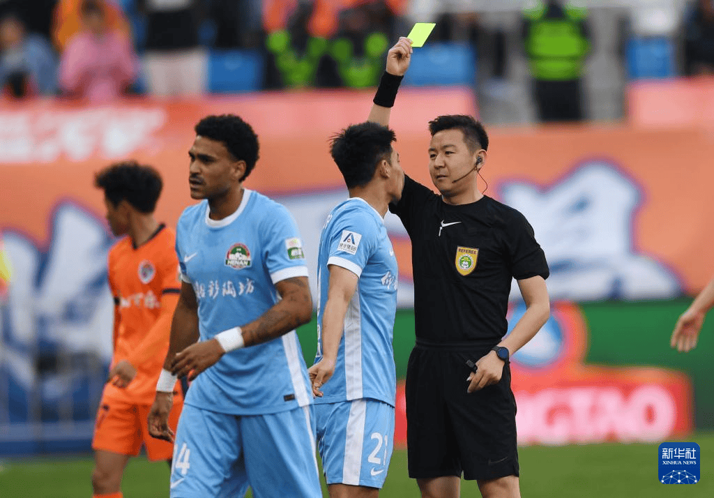 4月4日,本场比赛主裁判贺凯(右一)向河南队球员何超出示黄牌。