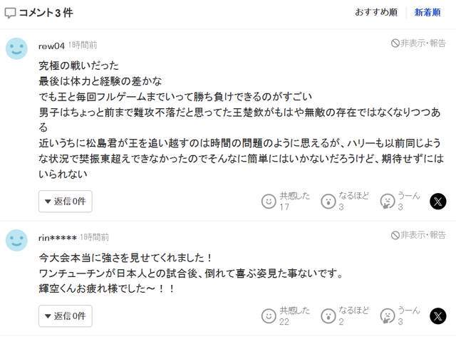 还有一位松岛拥趸留言道:“太可惜了。他真的把对手逼到了绝境。日本能拥有松岛这样的选手,着实令人欣喜。决赛和半决赛一脉相承,全程都是高强度激烈缠斗。一旦鏖战拖满七局,双方体能都走到极限,胜负走向本就充满变数。更何况对手是世界冠军、世界排名稳居首位的顶尖强者。接下来的世乒赛团体赛格外值得期待,这一枚银牌同样含金量十足。”