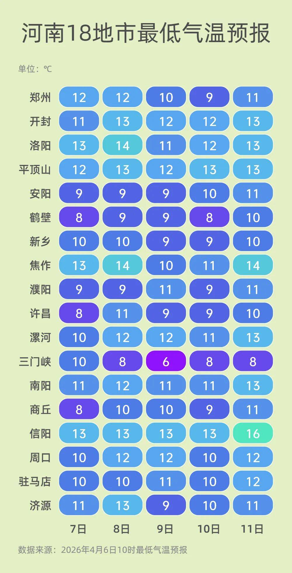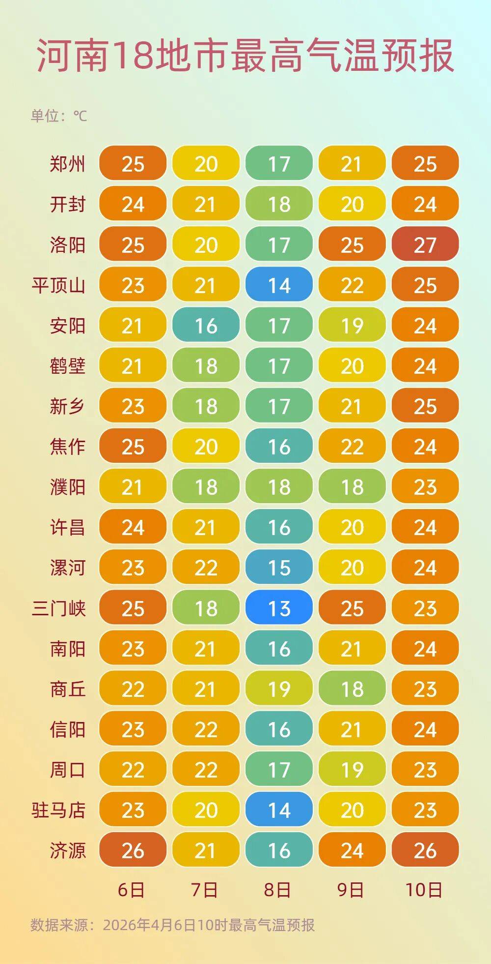 【大河财立方消息】4月6日,据河南气象,今天河南省大部维持晴朗天气。预计午后最高气温:北部20到22℃,其他地区23到25℃,天气晴暖适宜返程。