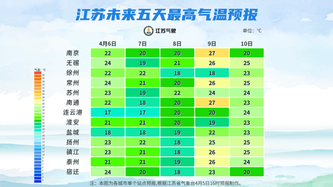全省多云。最高温度:本省东部地区17~18℃,其他地区20°C左右;最低温度:沿江以北东部地区6~7℃,本省西南部地区10~11℃,其他地区9℃左右。全省偏东风4-5级阵风6级。