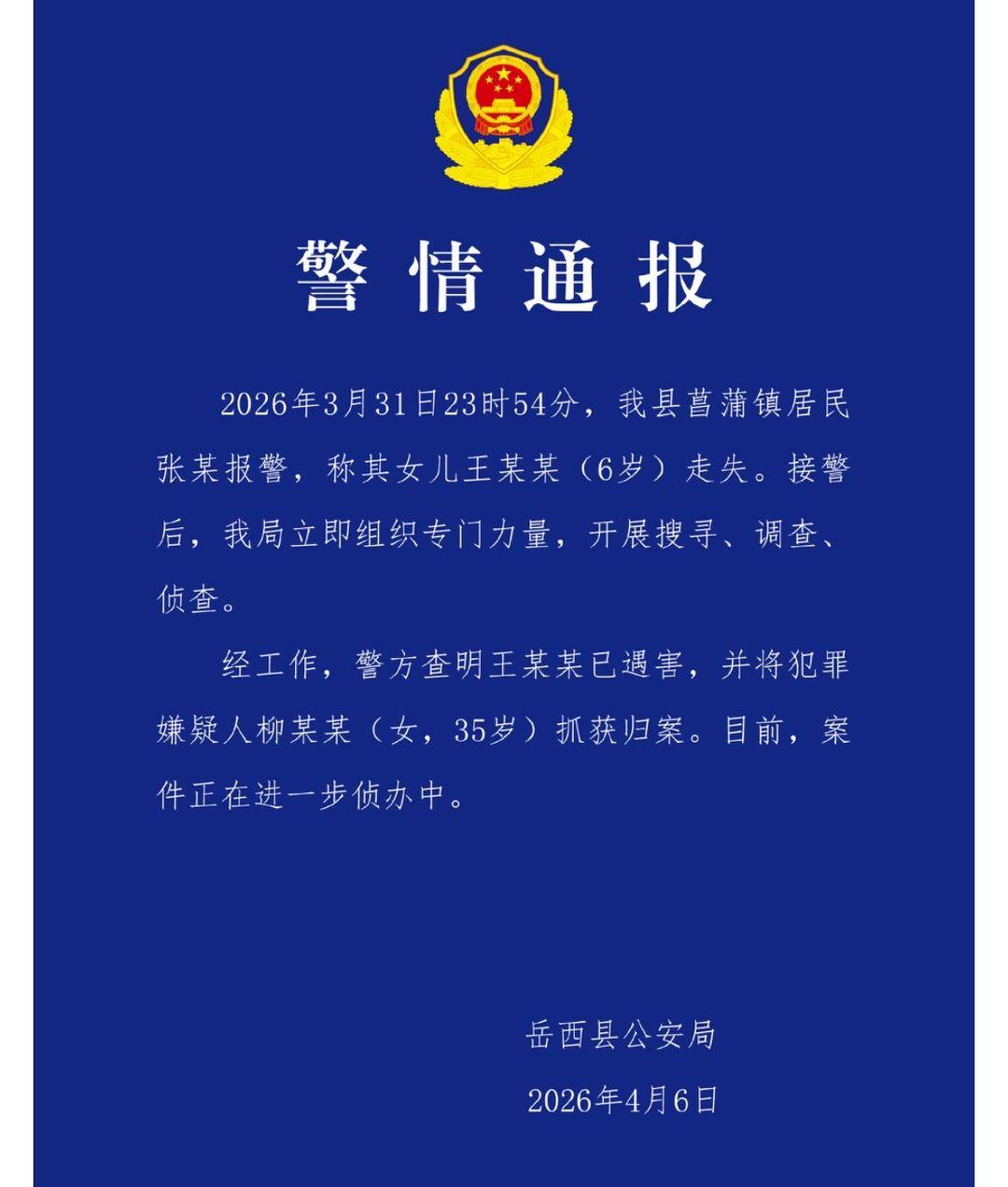 4月6日晚上,岳西县公安局发布警情通报,通报6岁女童走失最新进展。通报表明,3月31日23时54分,菖蒲镇居民张某报警,称其女儿王某某(6岁)走失。接警后,岳西县公安局立即组织专门力量,开展搜寻、调查、侦查。
