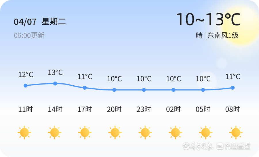 今天是4月7日,星期二,农历二月二十。青岛市迎来晴朗的好天气,气温介于10℃到13℃之间,东南风1级,空气湿度51%,PM2.5浓度为23,空气质量为优。今日天气适宜出行,市民可选择户外活动,但需注意早晨和傍晚温度较低,建议适当添衣保暖。根据天气情况,建议市民在上午和下午时段进行户外活动,享受良好的空气质量。随着气温逐步回升,市民可以适当调整衣物,避免感冒。此外,晴朗的天气也适合晾晒衣物和进行户外锻炼,市民可合理安排时间,享受春日阳光。总体来看,今日的天气状况为市民提供了良好的生活和出行环境。