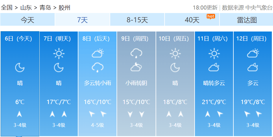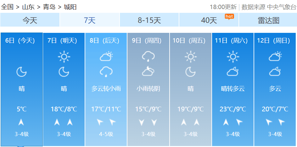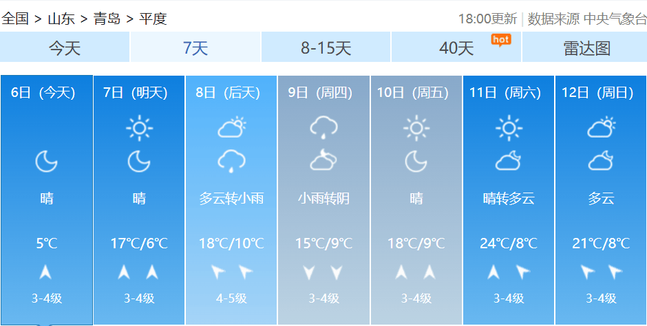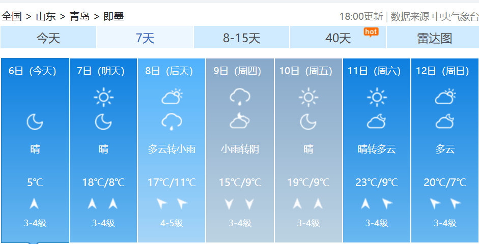 【青岛市区】7日白天,晴到少云,北风转南风3到4级,相对湿度30%~80%,7日最低气温8℃,最高气温14℃。