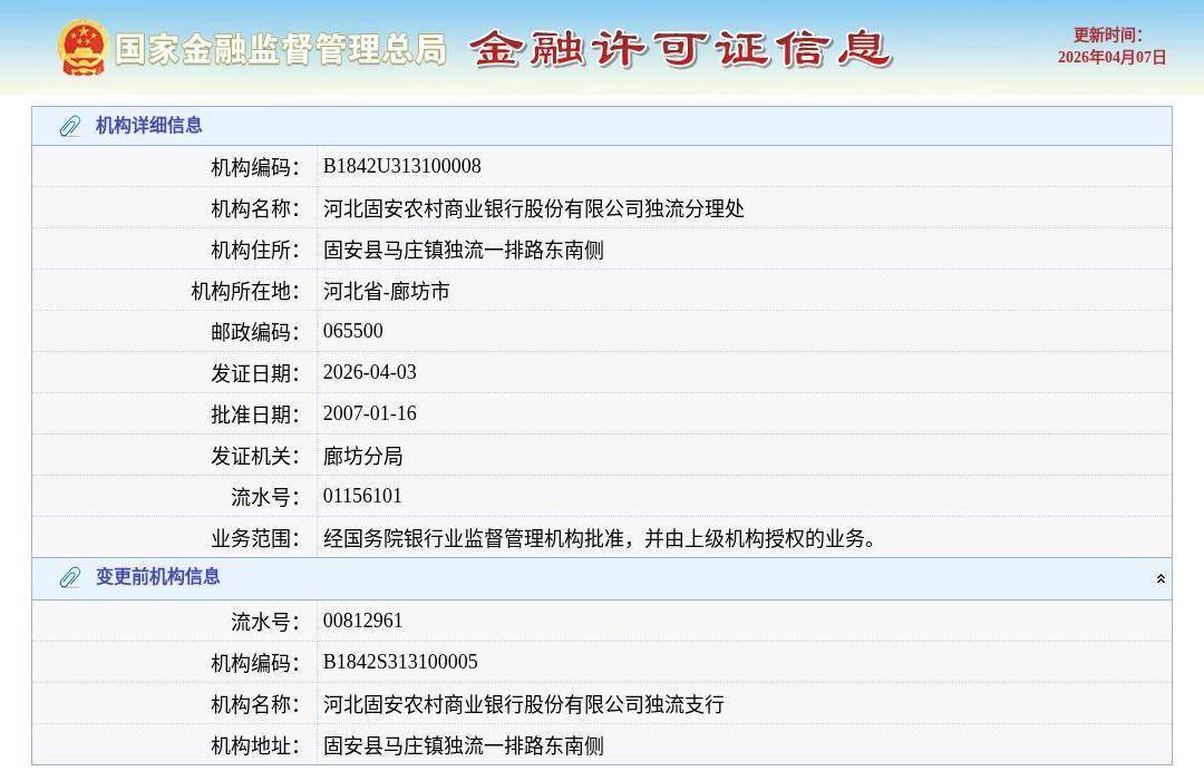 4月7日,根据国家金融监管总局许可证信息查询平台,河北固安农村商业银行股份有限公司独流分理处换发金融许可证,发证日期2026年4月3日。
