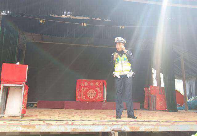 4月2日,新郑交管大队勤务五中队民警走进辛店镇岳庄村,借助集会场合,以戏台为载体,开展“美丽乡村行”交通安全宣传活动。