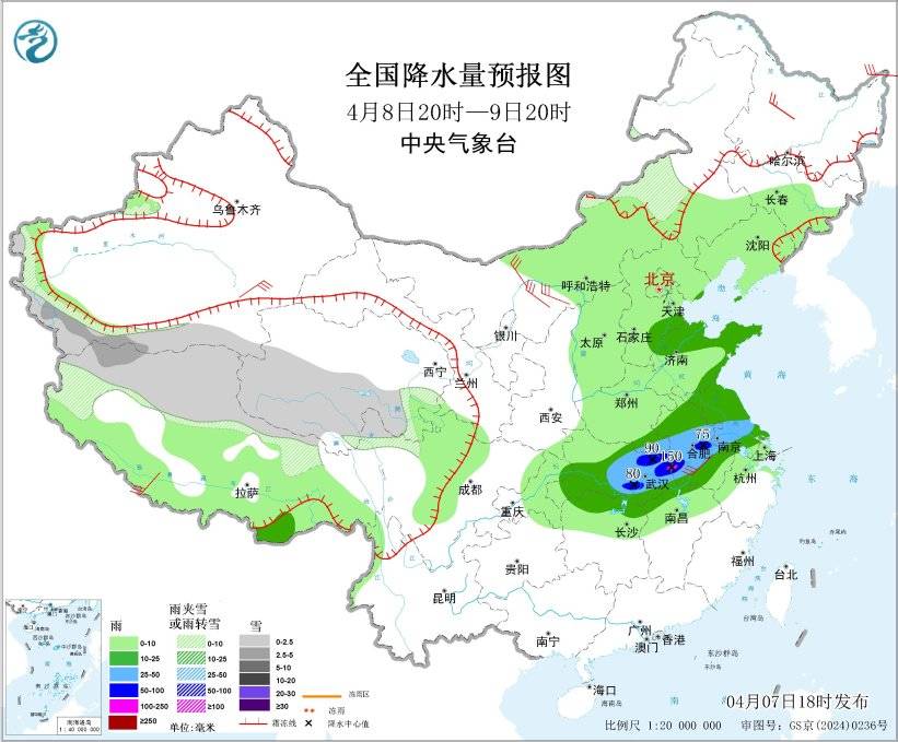 4月8日20时至9日20时,新疆南疆西部山区、青海南部、西藏北部、川西高原北部等地部分地区有小到中雪或雨夹雪;黄淮东部、江淮大部、江汉大部、湖南北部、江西北部等地部分地区有中到大雨,其中,湖北东部、苏皖西部等地部分地区有暴雨或大暴雨(100~150毫米)。新疆东部和南疆盆地、内蒙古、甘肃东部、宁夏、陕西北部、山西中北部、黑龙江北部、辽宁北部、西藏大部、云南、贵州中部、江苏南部、安徽南部、湖北东南部、湖南东部、江西等地部分地区有5~7级风,阵风8~9级;黄海中部和南部海域、东海北部和西南部海域有7级风、阵风8级(见图5)。
