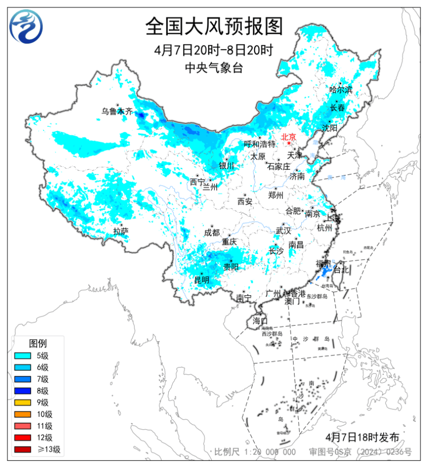 7日夜间至9日,西北地区东部、内蒙古、东北地区、西南地区等地仍有大风天气。中央气象台4月7日18时继续发布大风蓝色预警。预计,4月7日20时至8日20时,新疆东部和南疆盆地、内蒙古、甘肃东部、西藏大部、青海北部、吉林中西部、辽宁北部以及川西高原、云南、贵州等地部分地区有5~7级风,阵风8~9级;台湾海峡有7级风,阵风8级(见图3)。