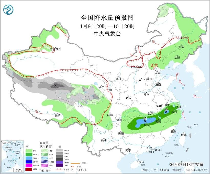 4月9日20时至10日20时,内蒙古东北部、新疆南疆西部山区、青海南部、西藏北部等地部分地区有小到中雪或雨夹雪,其中,西藏北部、青海西部等地部分地区有大雪(5~8毫米);新疆北部、西藏东南部、东北地区大部、华北东北部、江淮南部、江南大部、西南地区东部和北部等地部分地区有小到中雨,其中,安徽南部、湖南北部、江西西北部等地部分地区有大雨(25~45毫米)。内蒙古大部、青藏高原、山东半岛等地部分地区有4~6级风;东海大部海域有6~7级风、阵风8级(见图6)。