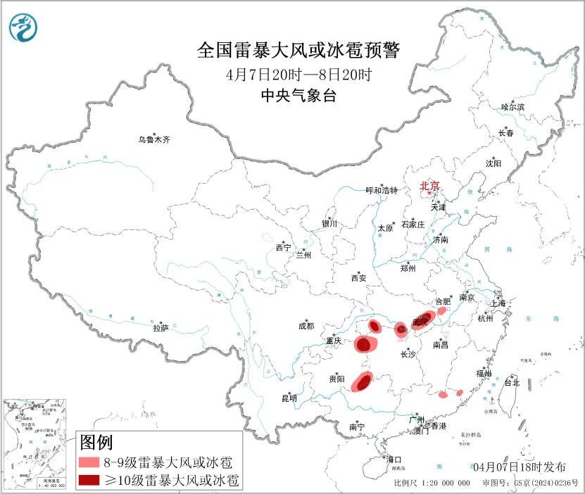 8日至9日,江汉、江淮、江南北部及重庆等地的部分地区有中到大雨,局地暴雨或大暴雨,并伴有短时强降水、雷暴大风或冰雹等强对流天气。中央气象台4月7日18时发布强对流天气蓝色预警。预计4月7日20时至8日20时,江汉、江淮西部、江南北部、西南地区东部等地的部分地区将有8级以上雷暴大风或冰雹天气,其中,湖北东部和南部、湖南西部、重庆东南部、贵州东南部、广西北部等地的部分地区将有10级以上雷暴大风,最大风力可达11级以上(见图1);重庆东北部、湖北西北部和中东部、安徽中部、湖南北部等地的部分地区将有小时雨量大于20毫米的短时强降水天气(见图2)。