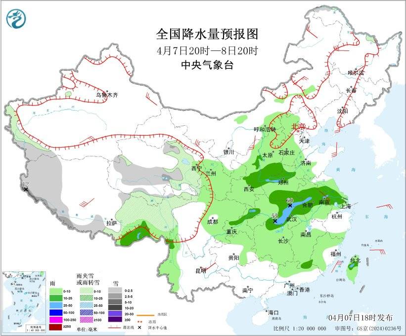 4月7日20时至8日20时,新疆南疆西部山区、西藏西部和东部、青海北部和南部、川西高原北部、黑龙江北部等地部分地区有小到中雪或雨夹雪,其中,西藏西部局地有暴雪(10~12毫米);西藏东南部、云南西北部、陕西中部、山西南部、河南北部和南部、安徽中北部、江苏西部、上海北部、湖北中东部、湖南北部、重庆东北部、台湾岛中部等地部分地区有中到大雨,其中,河南南部、湖北东北部和南部等地局地有暴雨(50~60毫米)。新疆东部和南疆盆地、内蒙古、甘肃东部、西藏大部、青海北部、吉林中西部、辽宁北部以及川西高原、云南、贵州等地部分地区有5~7级风,阵风8~9级;台湾海峡有7级风、阵风8级(见图4)。