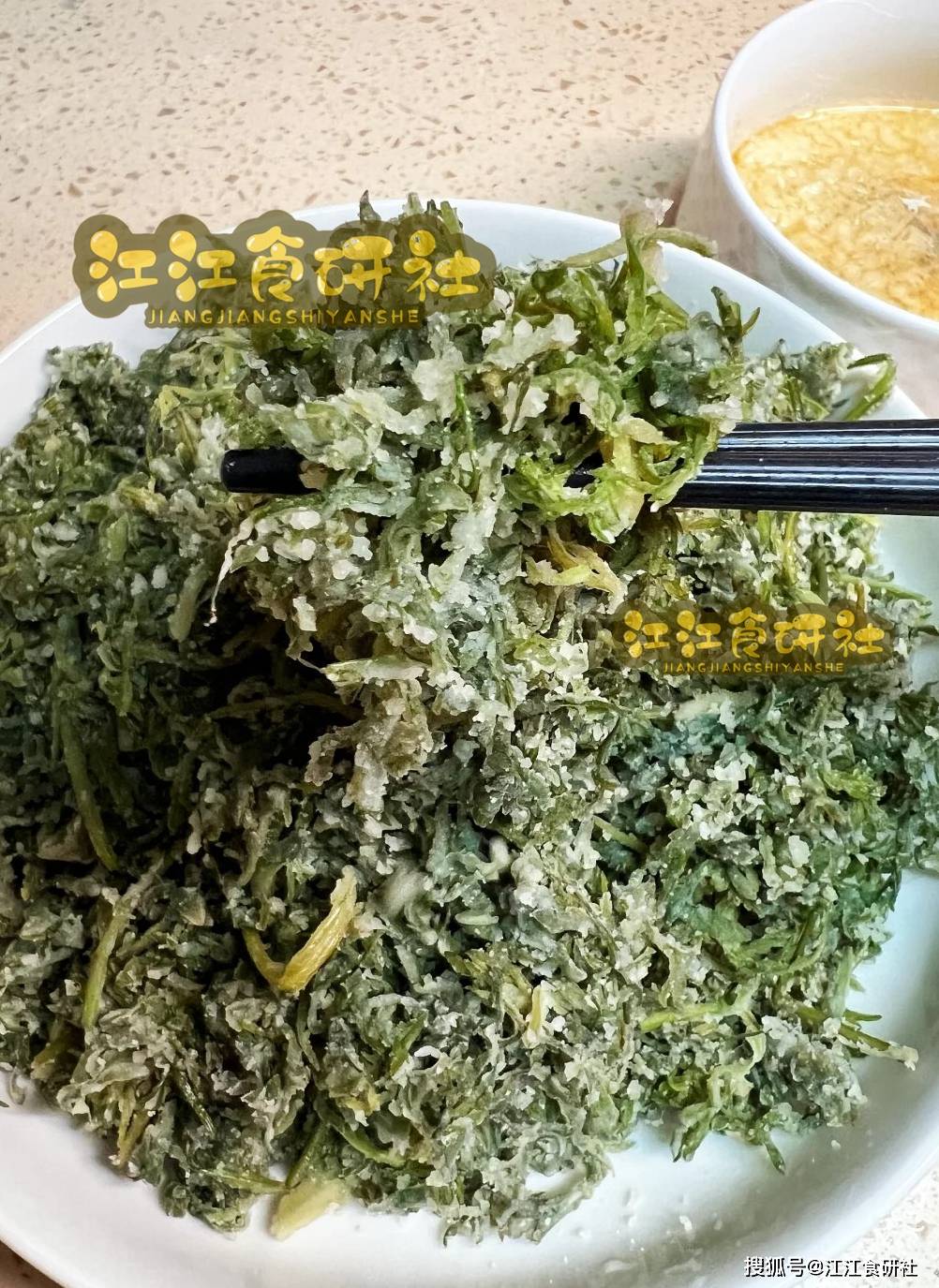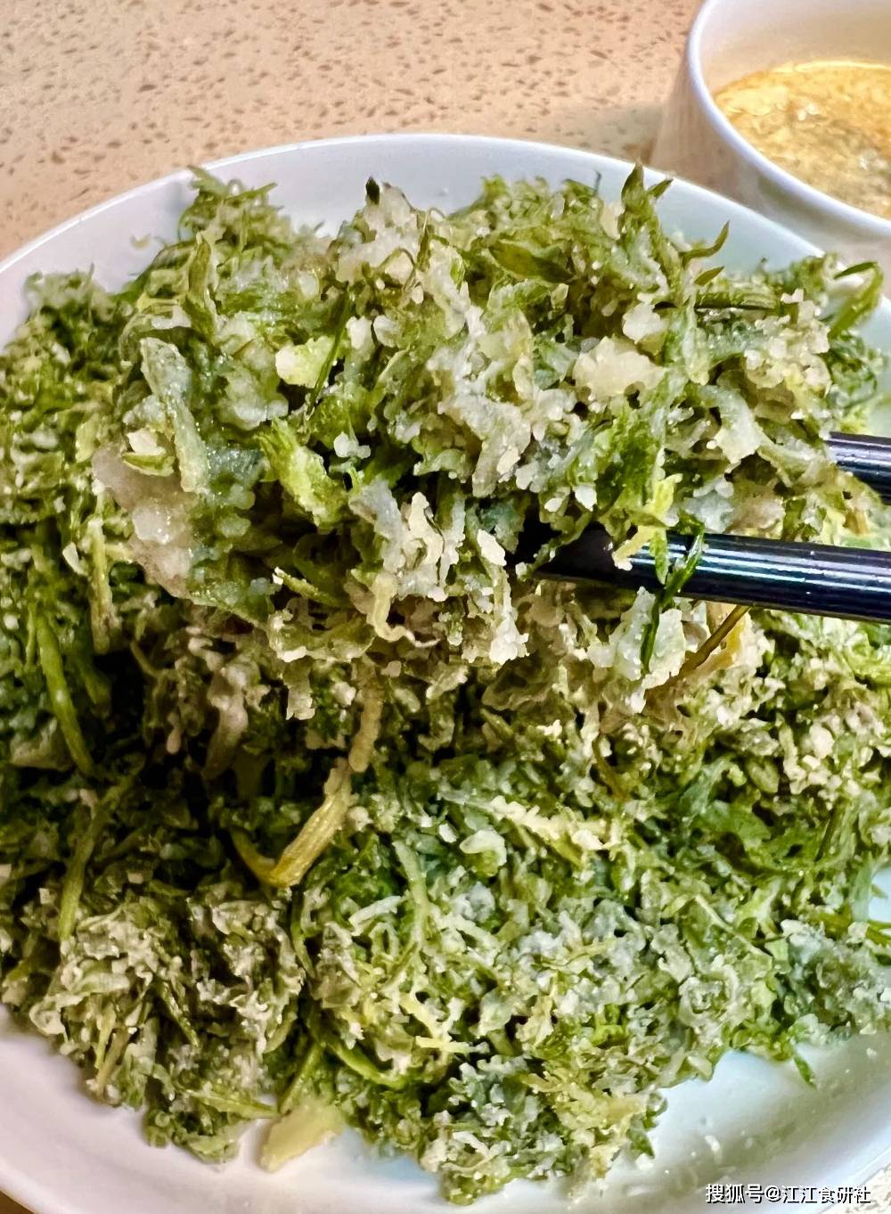 蒸好的白蒿,口感粉糯,带着谷物和野菜混合的天然香气。蘸上酸辣开胃的蒜泥汁,既化解了野菜的微苦,又增添了风味,是一道非常健康的养生主食。