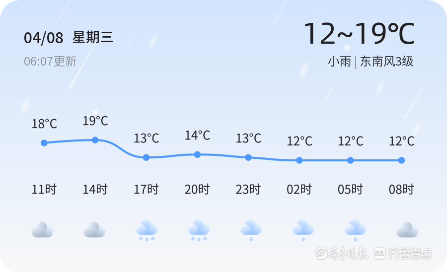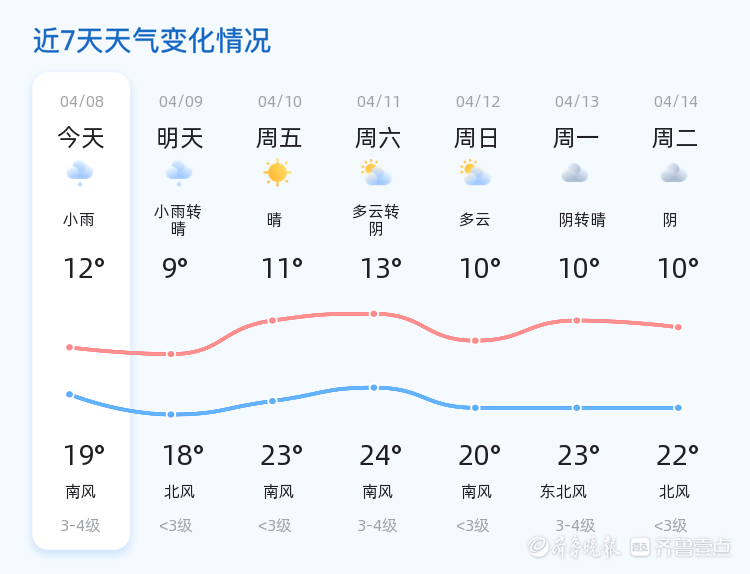 今天是4月8日,星期三,农历二月廿一。聊城今日天气以小雨为主,气温适中,最高气温19℃,最低气温12℃。全市各区均出现小雨天气,东南风3级,空气湿度为63%,PM2.5指数为54,空气质量良好。市民出行请注意携带雨具,注意交通安全。
