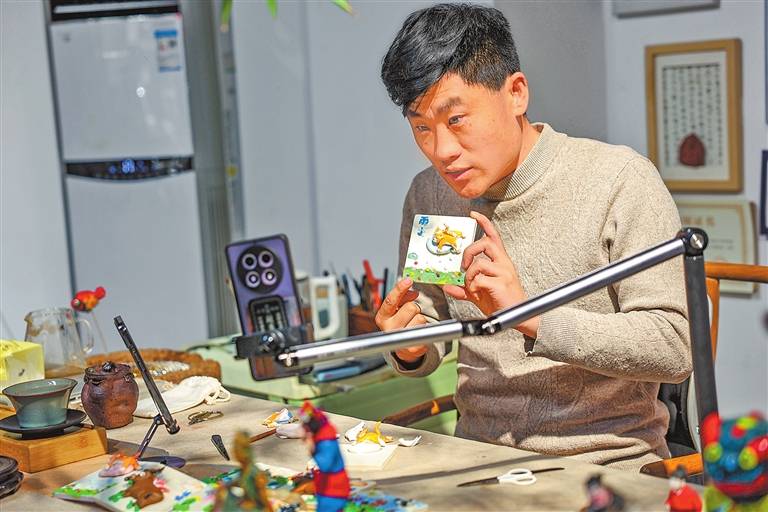 刘玉伟在直播演示面塑技艺,让网友云端学习面塑,助力非遗传播。