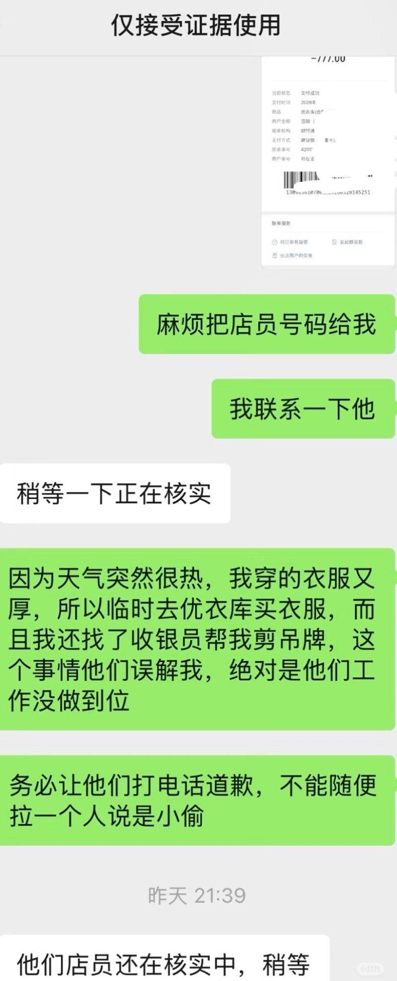 对此,优衣库相关区域负责人向记者否认了上述私聊中关于“50元私了”的说法,并介绍了门店常规的报警流程:“正常的流程是店员在当日盘点时发现衣物丢失,随后调取货架监控确认是否有顾客涉嫌偷窃,最后才会报警。警方到场查看监控确认有嫌疑后,才会联系当事人。并非我们随便拍张照片,警方就会出警。”该负责人坦言,此事确实是门店存在疏忽,并再次向张女士表达歉意,至于具体差错出在哪个环节,门店正在核查监控。