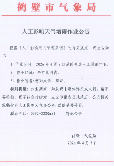 鹤壁市气象局发布人工影响天气增雨作业公告