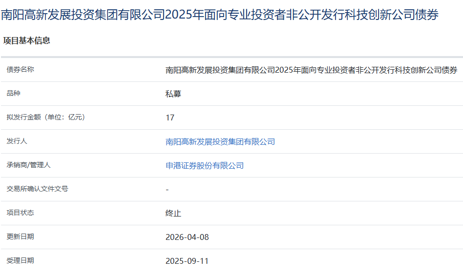 【大河财立方消息】4月8日,上交所债券项目信息平台显示,南阳高新发展投资集团有限公司2025年面向专业投资者非公开发行科技创新公司债券项目状态更新为“终止”。该债券拟发行金额17亿元,承销商/管理人为申港证券。