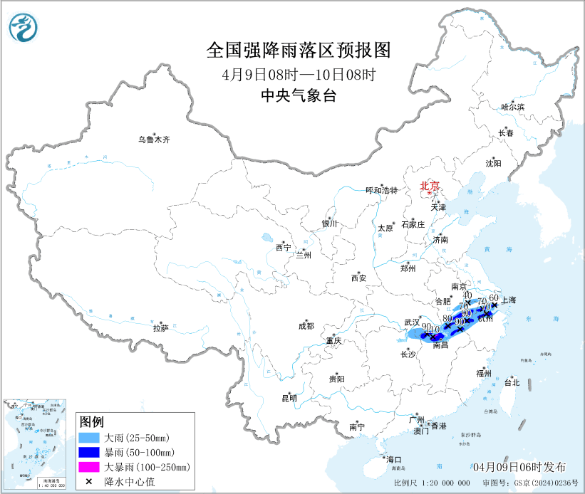 中央气象台4月9日06时继续发布暴雨蓝色预警: