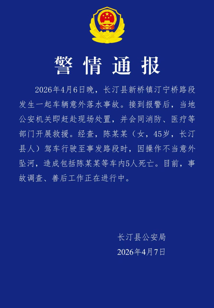 4月7日,福建长汀公安发布警情通报:2026年4月6日晚,长汀县新桥镇汀宁桥路段发生一起车辆意外落水事故。