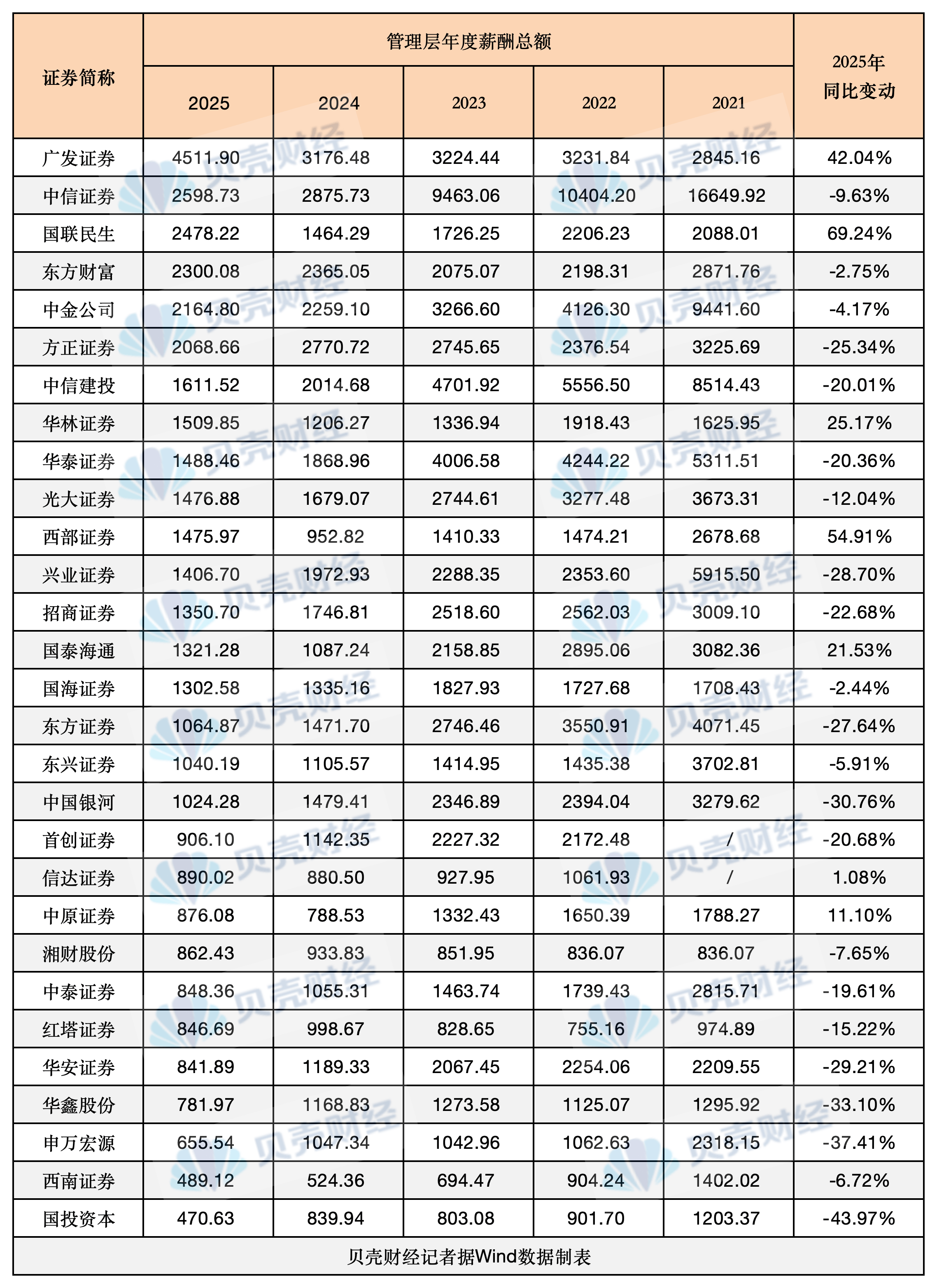 29家A股上市券商管理层年度薪酬总额变动