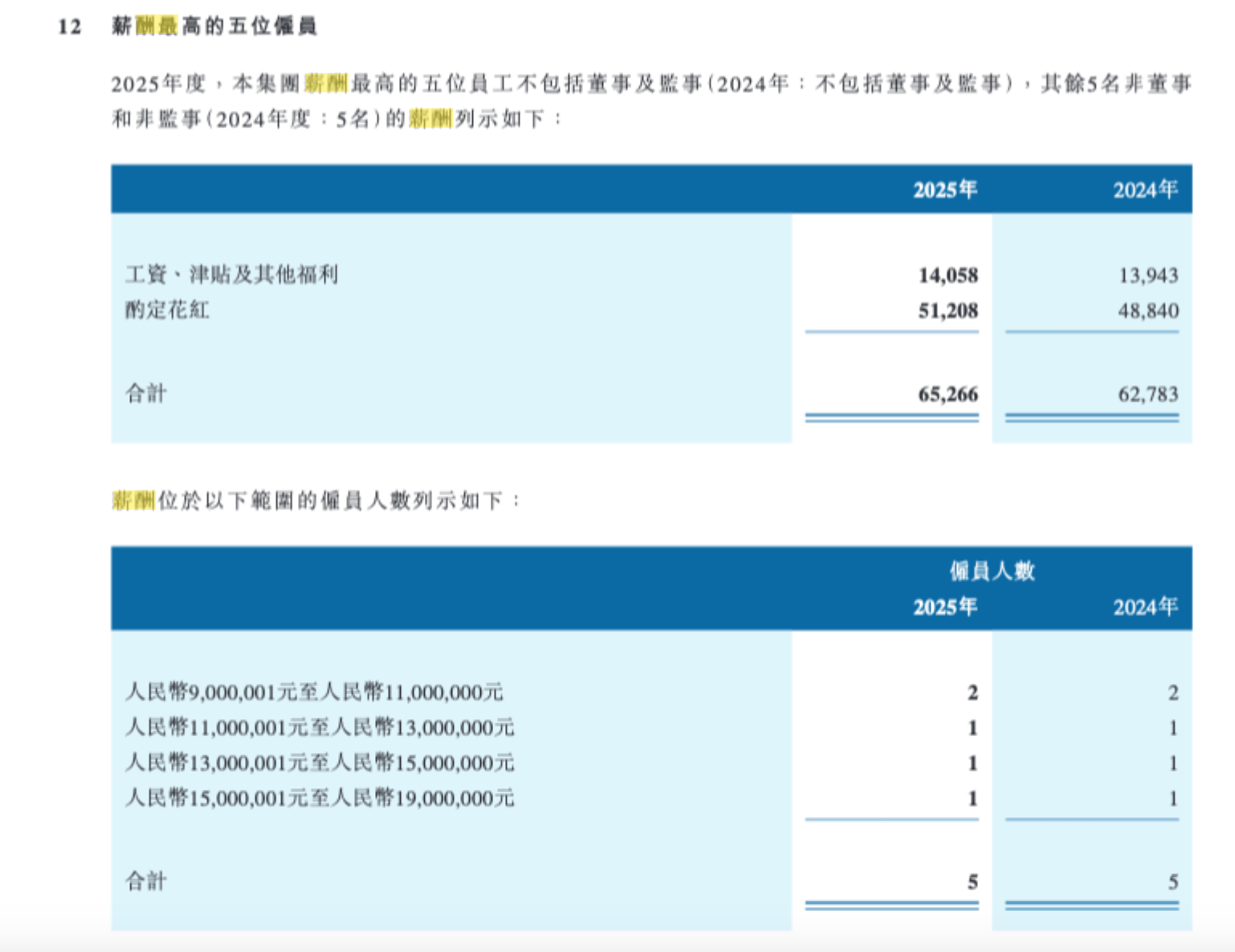 广发证券港股年报也显示,年内(2024年)薪酬最高的五名雇员均非公司董事或监事,其薪酬主要集中在500万元至1000万元之间。