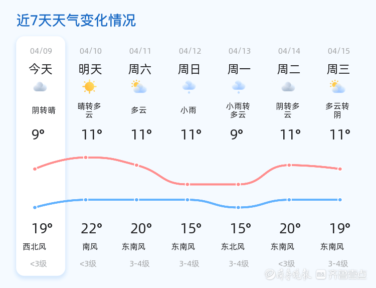 未来三天天气趋势总体平稳。4月11日,全市多云,气温11℃至20℃,东南风3-4级;4月12日,将迎来小雨天气,气温有所下降,最高气温15℃,最低气温11℃,市民需注意防雨保暖;4月13日,天气由小雨转为多云,气温9℃至15℃,东北风3-4级。