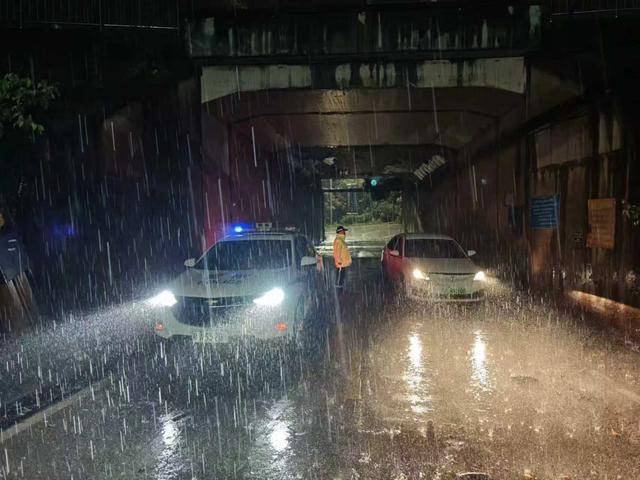 暴雨期间,民警在低洼桥洞值守