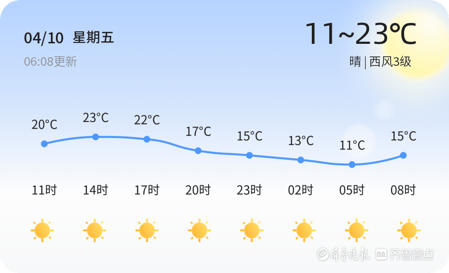 今天是4月10日,星期五,农历二月廿三。临沂市迎来晴朗天气,气温在11℃至23℃之间,西风3级,空气湿度较高,PM2.5指数为57,空气质量良好。各区天气状况一致,均为晴朗,适合市民外出活动。