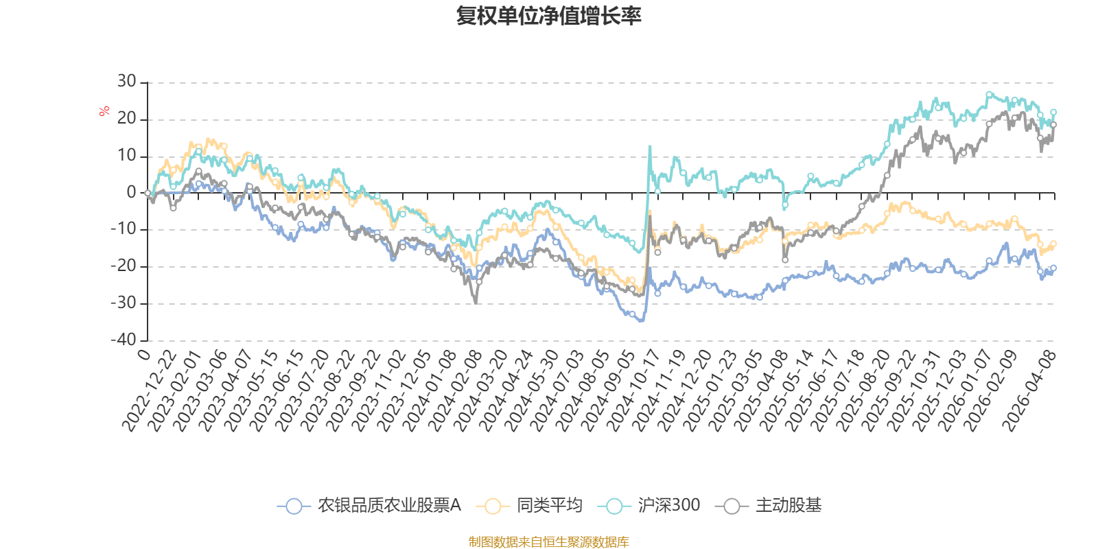 截至4月8日,农银品质农业股票A近三个月复权单位净值增长率为-1.54%,位于同类可比基金5/43;近半年复权单位净值增长率为-0.73%,位于同类可比基金5/43;近一年复权单位净值增长率为4.44%,位于同类可比基金12/43;近三年复权单位净值增长率为-20.71%,位于同类可比基金20/41。