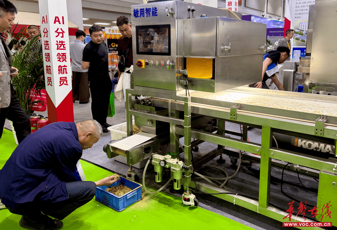 展馆内,一台AI智能分选设备前围满观众:履带上的中药材经过检测系统,实现智能分选,剔除混入其中的石子及其他杂质,药材则顺畅流入成品区。