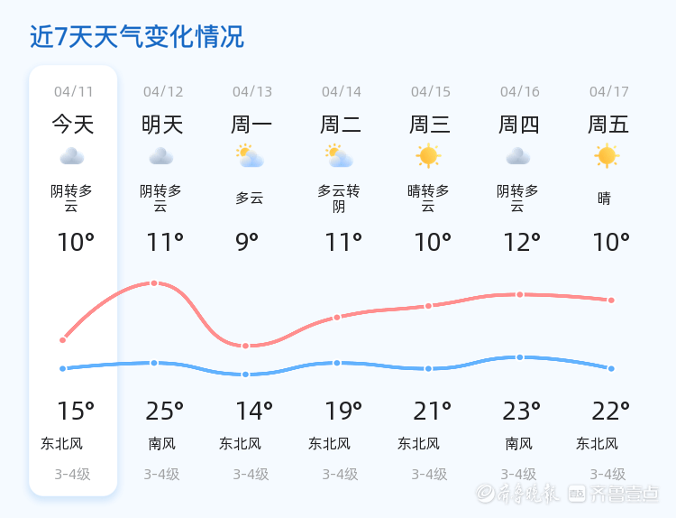 今天是4月11日,星期六,农历二月廿四。烟台市今日天气晴转多云,气温在10℃至15℃之间,西北风2级,空气湿度为59%,PM2.5指数为53。各区天气情况基本一致,整体天气较为舒适,适合市民外出活动。