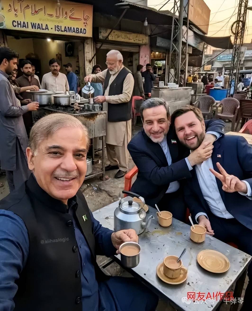 最后,看到一张明显是外国网友AI创作的照片:在伊斯兰堡地摊前,巴基斯坦总理夏巴兹请大家喝咖啡,伊朗外长阿拉格奇高兴地搂着美国副总统万斯的脖子,万斯则兴奋地比了个V字,远处,似乎印度总理莫迪还在倒咖啡提供服务……