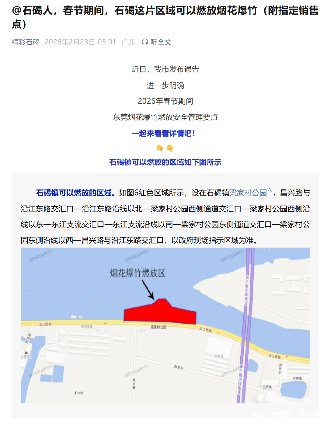 石碣镇可燃放区域设在梁家村公园,而事发地为禁燃区。