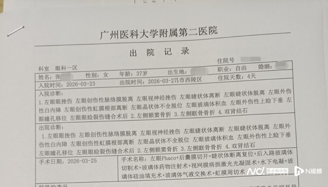 张女士提供的一份《出院记录》显示,出院诊断为左眼眼挫伤、左眼创伤性脉络膜脱离、左眼视神经挫伤、左眼睫状体离断、左眼睫状体脱离、左眼外伤性白内障;左眼创伤性虹膜根部离断、左眼晶状体不全脱位、左眼玻璃体积血、左眼外伤性上睑下垂、左眼瞳孔移位、左眼眼睑裂伤缝合术后;左侧额窦骨折;左侧眶骨骨折。