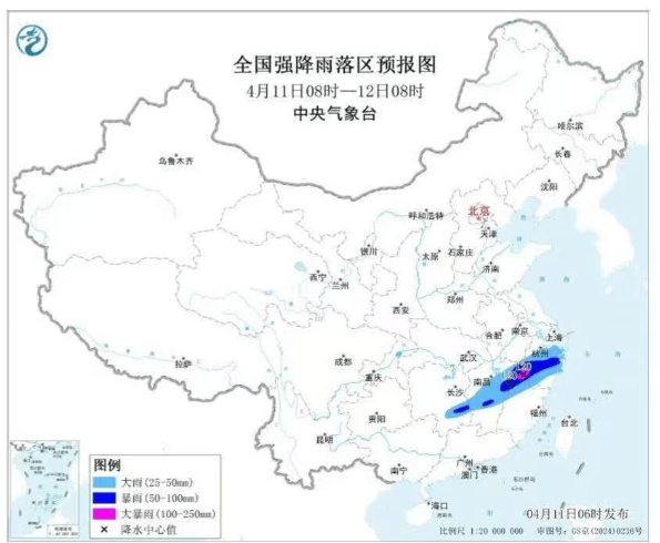预计,4月11日8时至12日8时,湖南东南部,江西中部和东北部,浙江中南部,福建西北部等地部分地区有大到暴雨,其中,江西东北部、浙江西南部等地部分地区有大暴雨(100~120毫米)。上述部分地区伴有短时强降水(最大小时降雨量20~40毫米,局地可超过50毫米),局地有雷暴大风和冰雹等强对流天气。