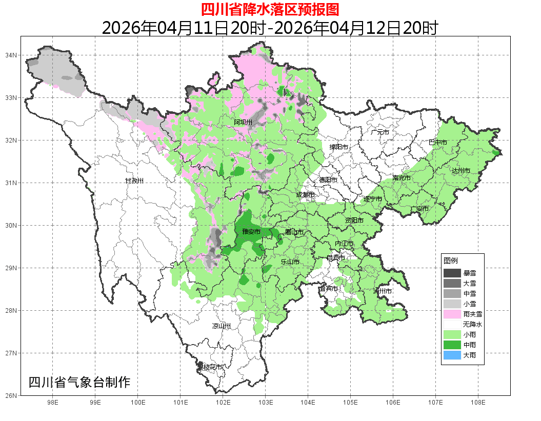12日晚上到13日白天:盆地各市阴天间多云有阵雨或雷雨,东部及西部沿山有中雨,个别大雨;川西高原和攀西地区北部阴天间多云有阵雨(雪)或雷雨,局地有中雨(雪),个别大雨(雪),攀西地区其余地方多云间晴。
