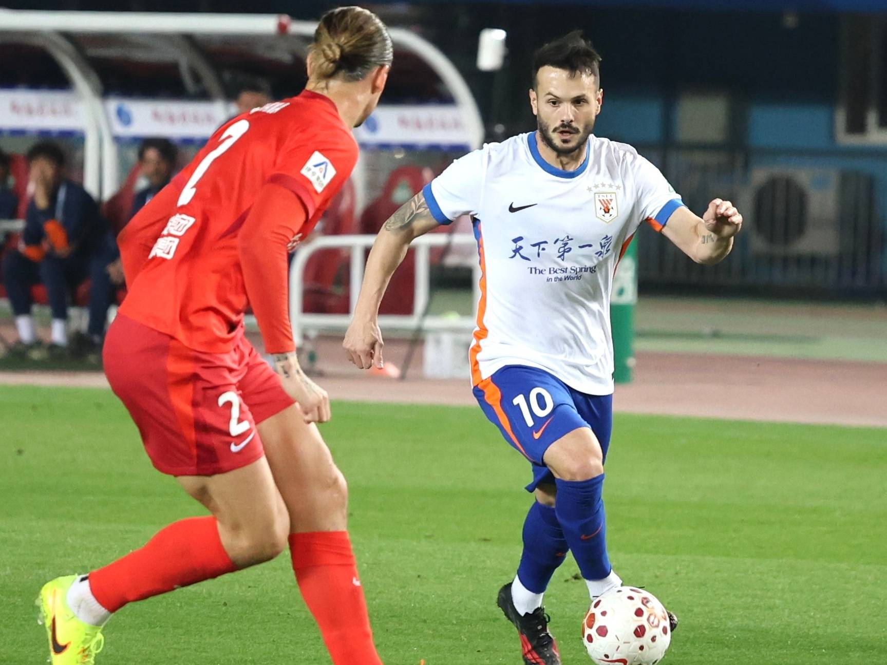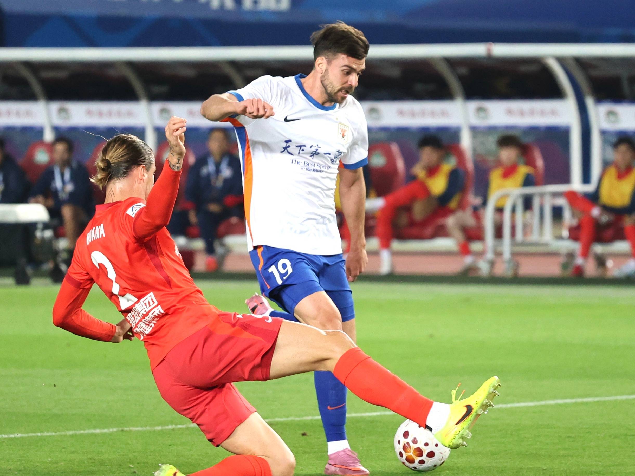 顶住对手开局的攻势,泰山队逐渐创造出更多威胁球机会。第18分钟,马德鲁加中路送出精准直塞,泽卡单刀球挑射被快速回防后卫封出底线。第22分钟,陈泽仕挑传泽卡,可惜被出击的王国明破坏。