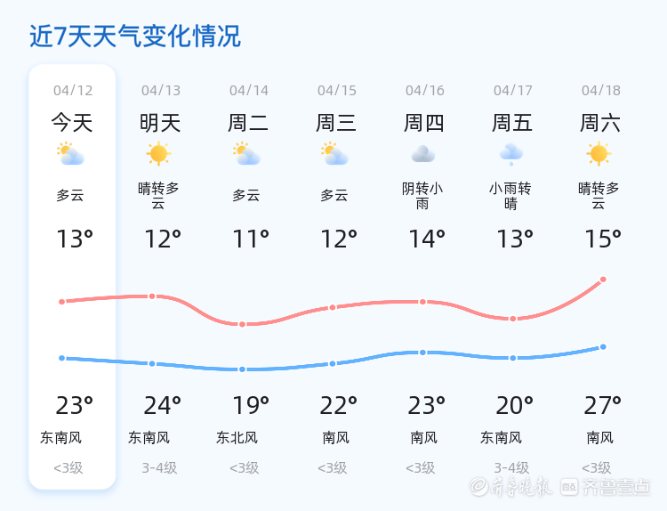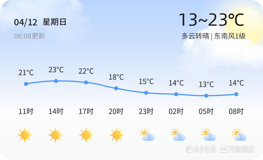 今天是4月12日,星期日,农历二月廿五。菏泽市今日天气多云转晴,气温适宜,最高气温23℃,最低气温13℃,东南风1级,空气湿度较高,为84%。全市各区天气情况总体平稳,市民出行适宜,建议根据实时天气情况适时增减衣物。