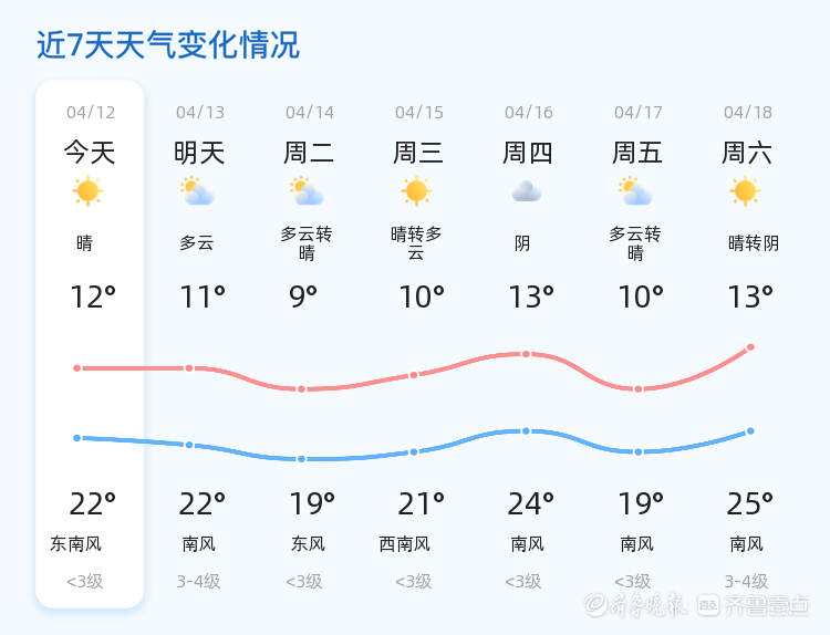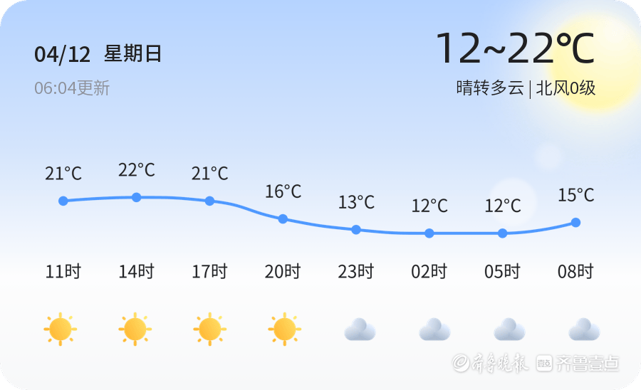 今天是4月12日,星期日,农历二月廿五。济宁市今天的天气为晴转多云,气温在12℃到22℃之间,北风0级,空气湿度为100%,PM2.5指数为86,空气质量良好。全市各区天气情况总体一致,市民可以放心进行户外活动。
