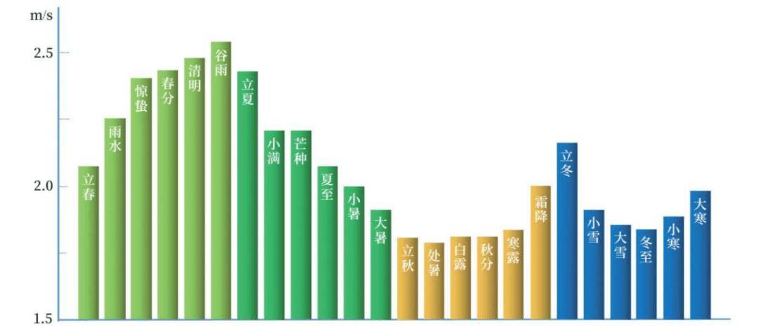 在华北及黄淮地区,清明与谷雨是全年大风频发最为集中的节气,如图 1。元代《月令七十二候集解》提到“万物齐乎巽”中的“巽”,即指清明时节的东南风。温暖而强劲的东南风遭遇冷空气便形成降水,“春风送暖”与“春风化雨”由此而来。春风在造就“满路桃花春水香”的同时,也带来漫天飘絮,遮蔽驾驶视线、诱发过敏,给田间劳作与交通出行平添扰乱。